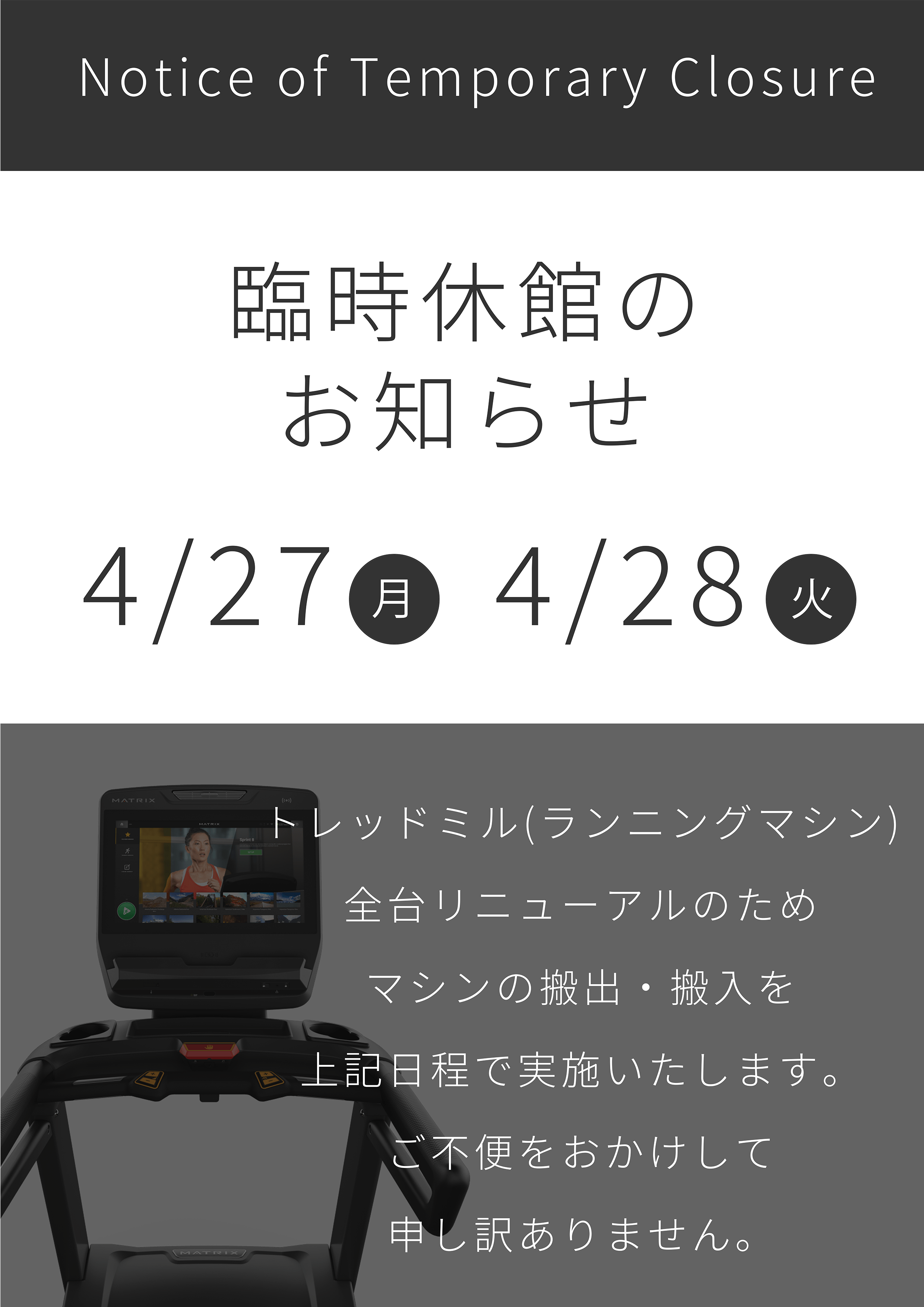 トレッドミル(ランニングマシン)全台リニューアルのためマシンの搬出・搬入を実施いたします。